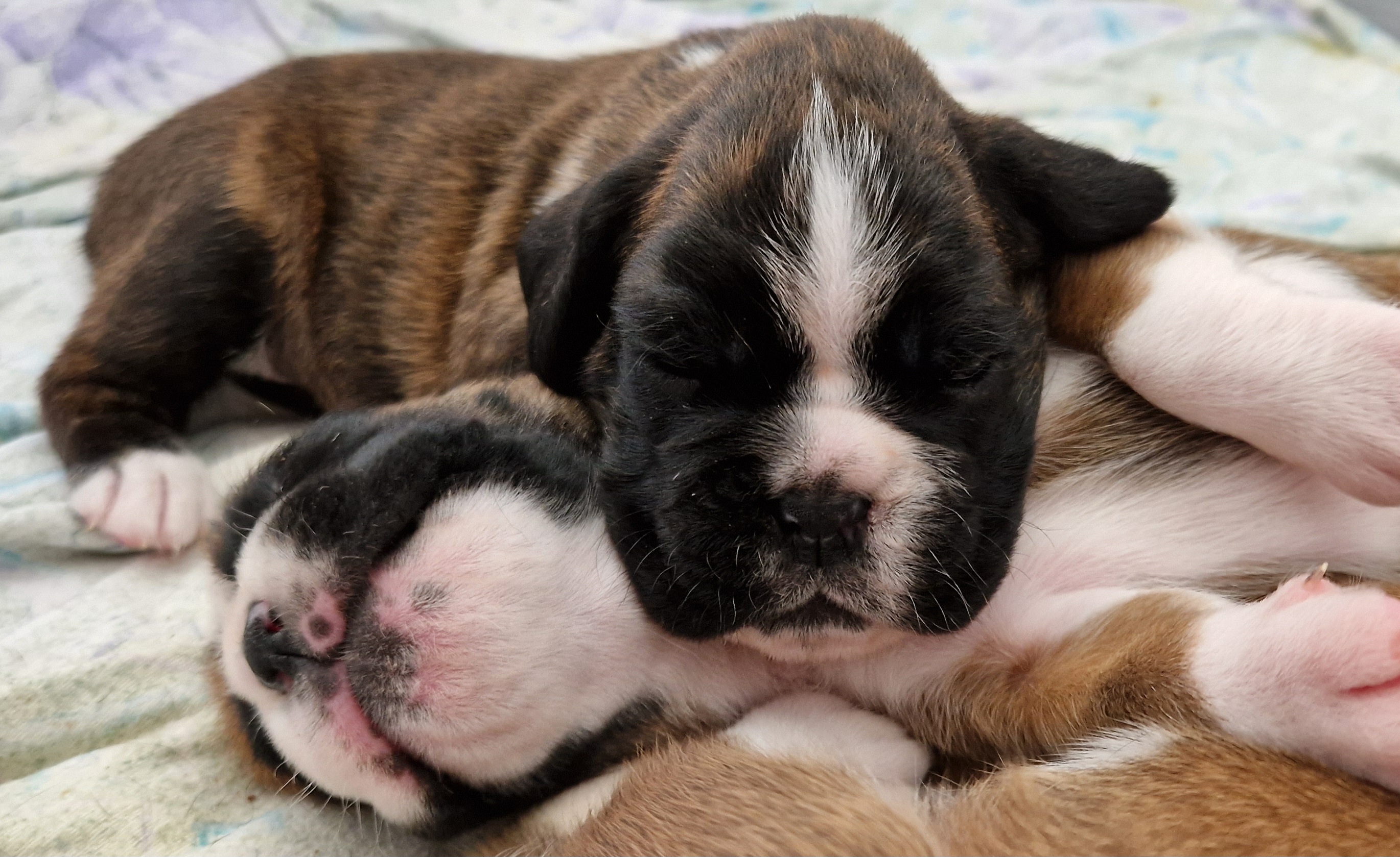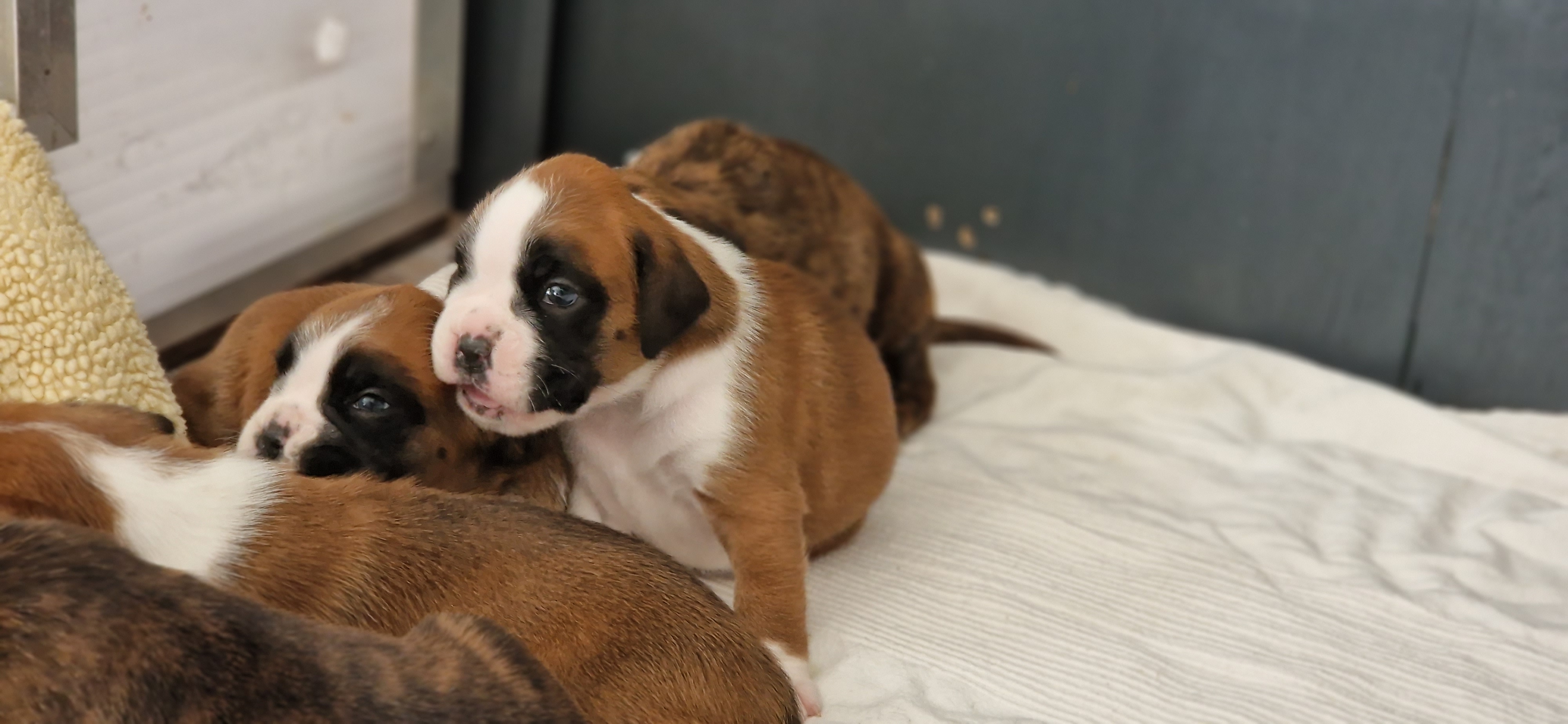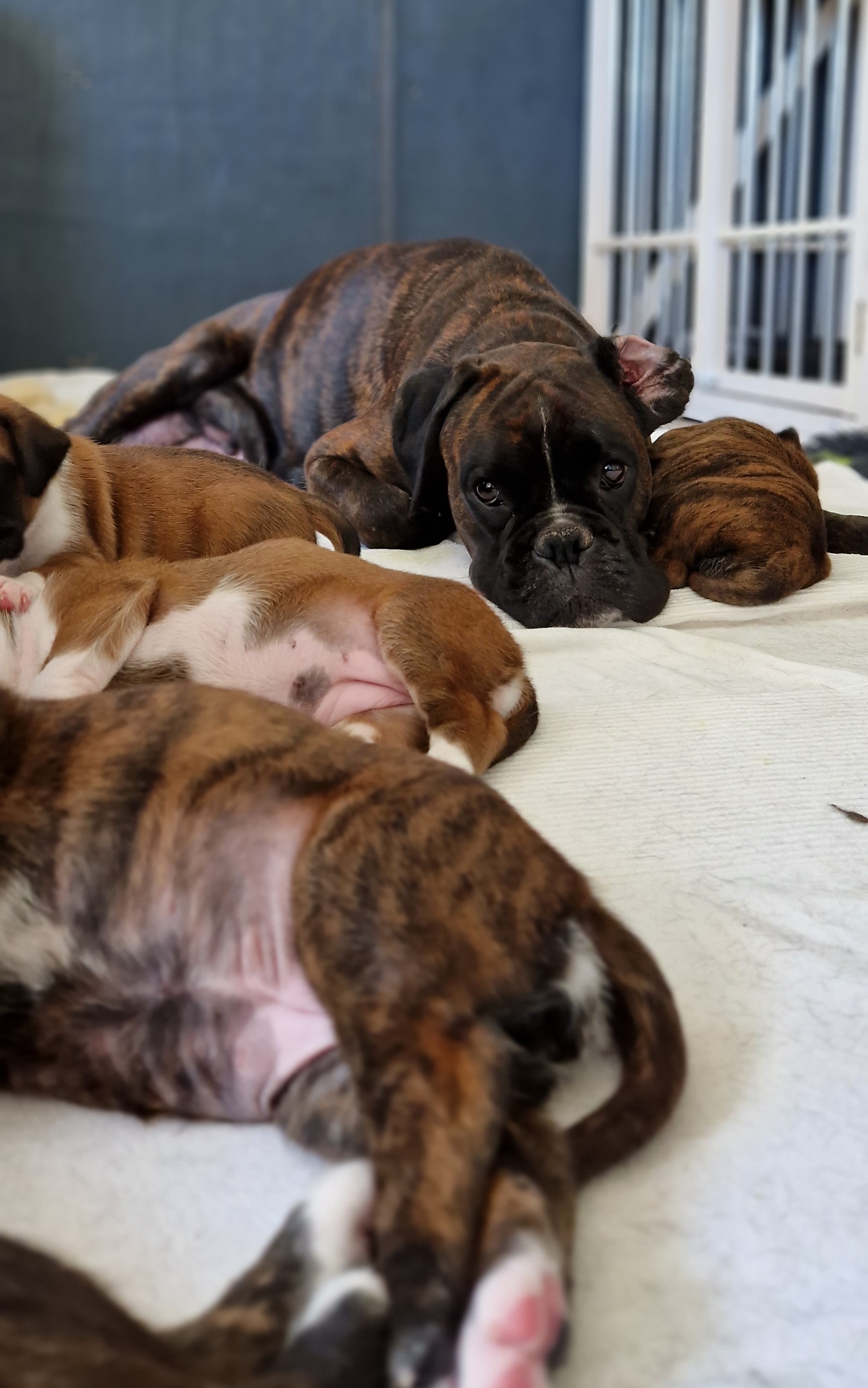 Wir freuen uns somit über 5 Stramme Mädchen und unseren kleinen Quotenrüden (1/2 gestromt und 0/3 gelb). Arya ist eine vorbildliche Mama und wir hoffen auf eine sorgenfreie Aufzucht. ...